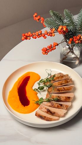 Домашняя индейка гриль с морковным кремом и клюквенным соусом